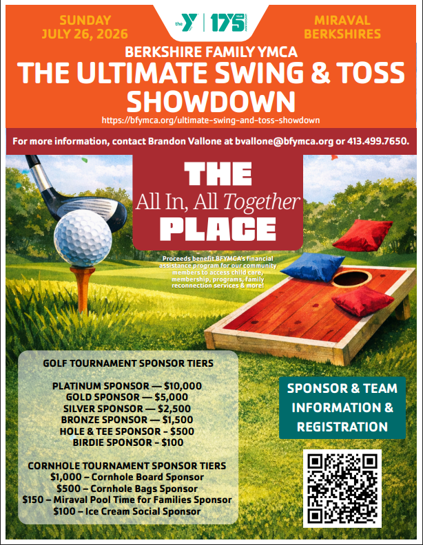 The true strength of the Y flows from the hearts and actions of every neighbor who believes in our vision for a stronger community for all. Fundraisers, such as our golf tournament, support scholarships and guarantees that every individual can access vital resources to learn, grow, and thrive. Make a lasting impact on the lives of those around us and deepen your connection with the community by supporting the The Ultimate Swing & Toss Showdown, Berkshire Family YMCA's 2026 fundraiser! Contact bvallone@bfymca.org for more information or secure your spot now.
